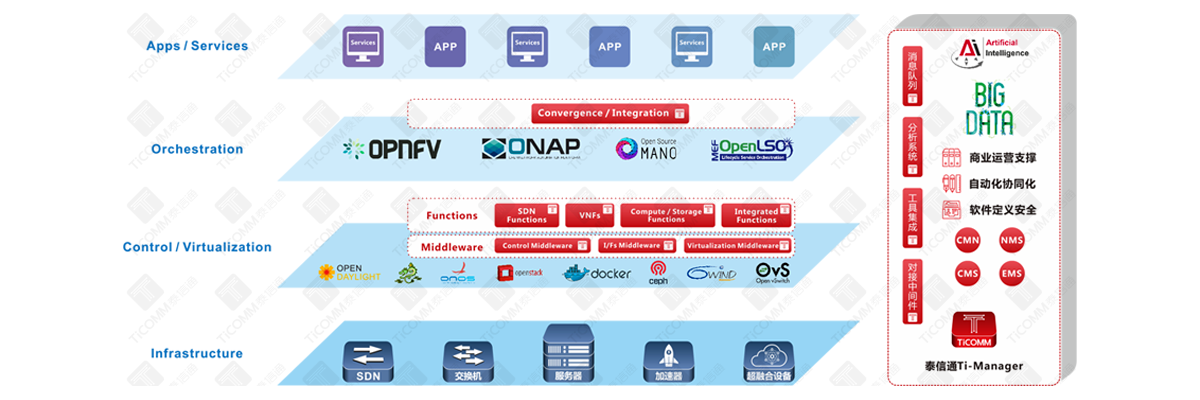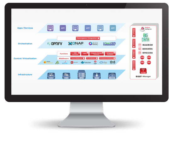 泰信通Ti-Manager云网运管维平台基于云计算、大数据、互联网+的需求应运而生,针对云和SDN运管维搭建技术架构,以智能化、自动化提升资源管控的效率,融合云网的运营、管控、维护,构建一体化、全局可视的智能平台。