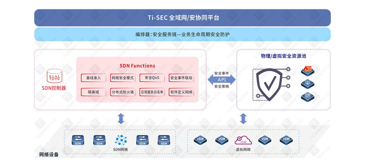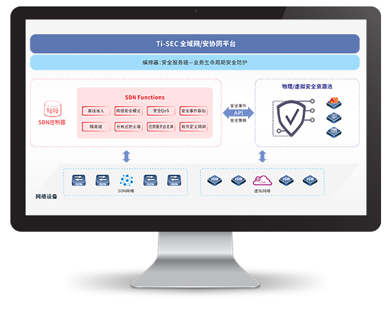 泰信通Ti-SEC全域网/安协同平台,集预防、分析、协同和审计全流程一体化的、软件定义的安全管理平台,适用于虚拟化、多业务、多租户等复杂流量模型场景。